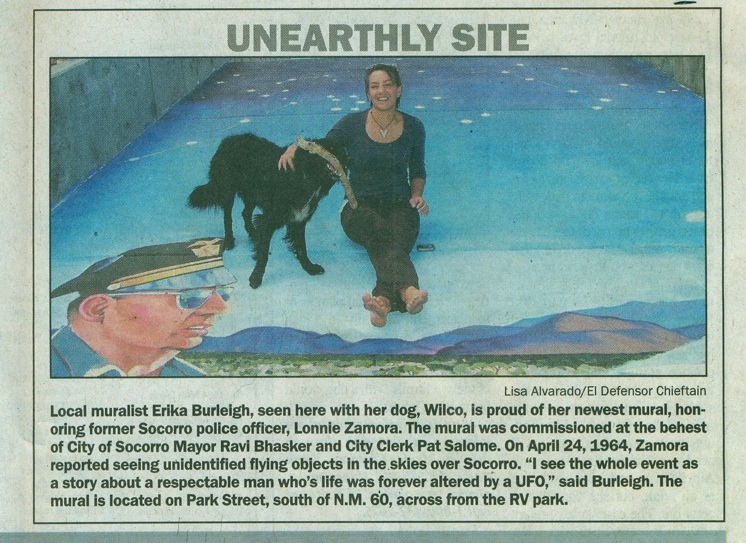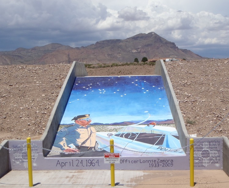 Commemorating Officer Lonnie Zamora Park Street, one mile south of the Plaza in Socorro, New Mexico. Acrylic on Stucco, 15'x 42' (2012)