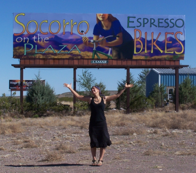 Billboard for Manzanares Street Coffeehouse and the Spoke'N Word Cycles. Digital (2008) located on I-25 southbound outside of Lemitar, New Mexico.