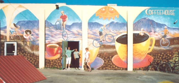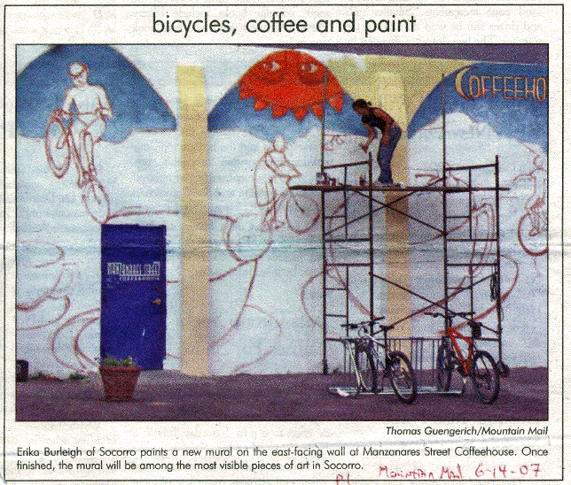 Bikes and Beans 110 Manzanares Street, near the Plaza in Socorro, New Mexico. Acrylic on Stucco, 16'x 36' (2007)